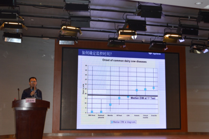 勃林格殷格翰国际贸易有限公司成晓峰技术员做题目为奶牛围产后期监控与低血钙防治的报告。