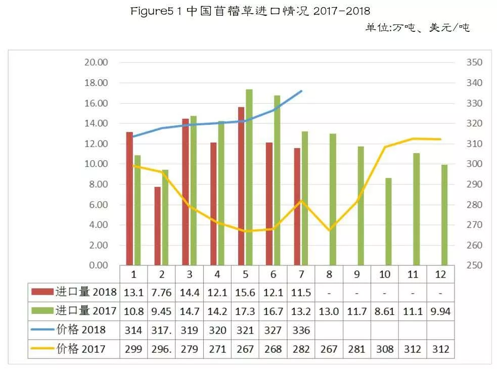 5.1.1 苜蓿干草1-7月中国进口86.88万吨,同比减10.1%